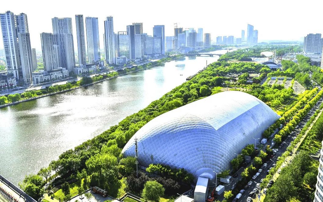 一是规模最大。气膜长165米、宽80米、高37米,气膜内最大净高差达60米,建筑面积13200平方米,气膜展开面积达21000平方米。