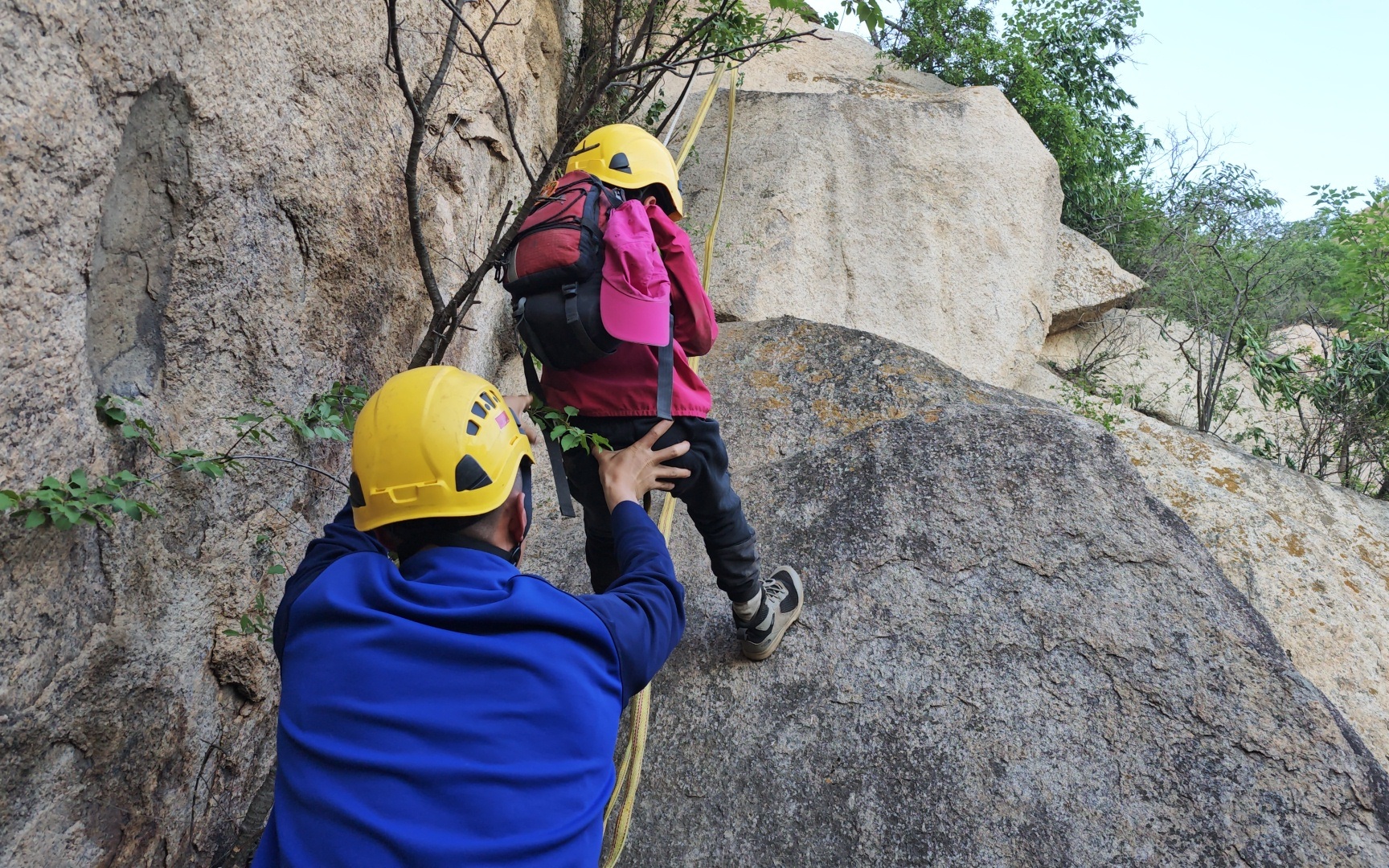 救援人员忽然听到一声呼救,在安抚好被砸伤者情绪后,救援人员对呼救的母子展开救援。救援人员利用专业的绳索救援技术爬上了陡峭的山体,为这对母子进行了绳索加固,并将他们护送到安全位置。