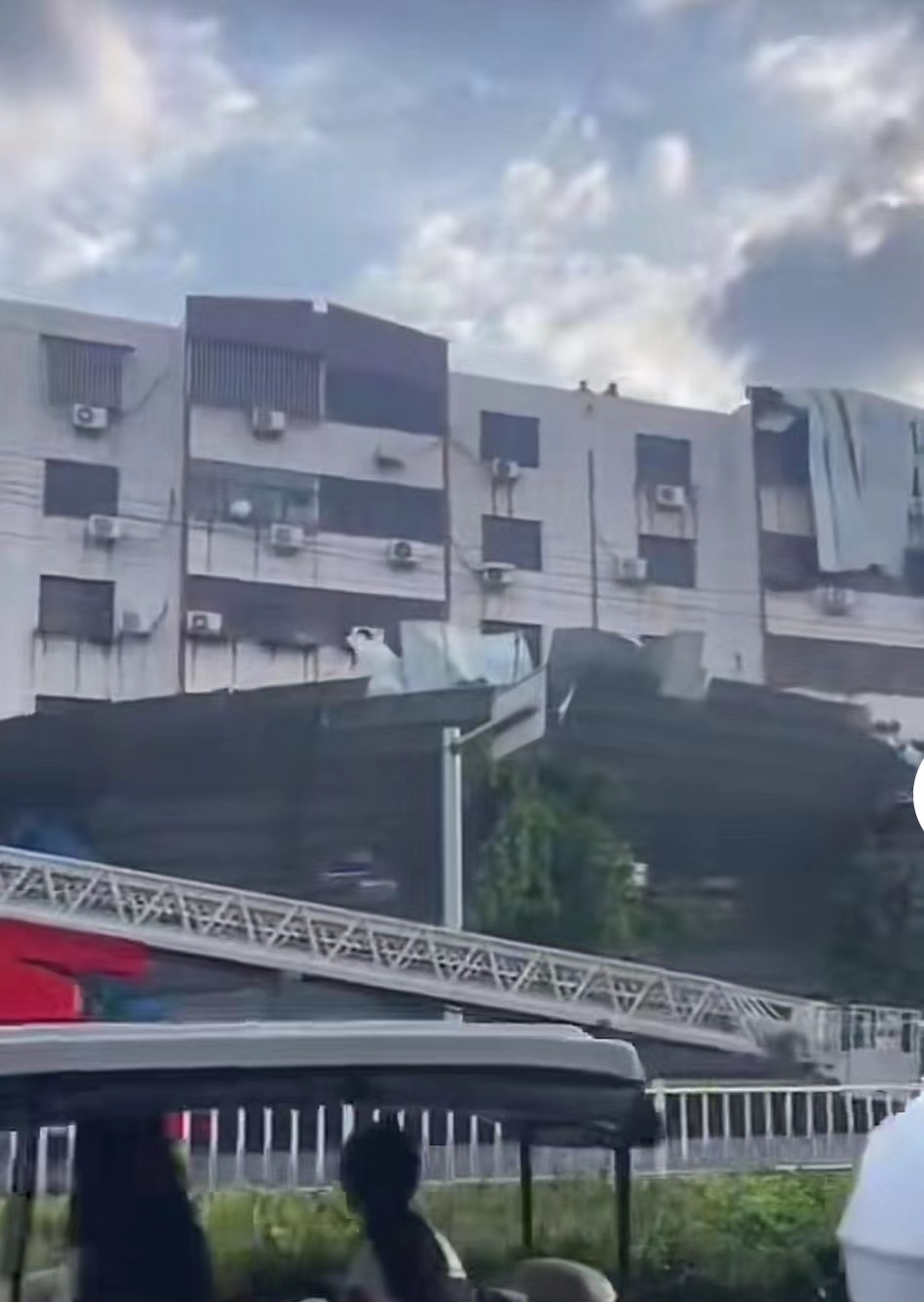 现场视频显示,楼房的铁皮顶掉到地面上,大部分卡在楼体和行道树之间,有的树已经被压歪了,附近还有消防救援人员。