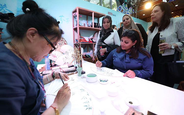 外国嘉宾正在学习绘画伞面。