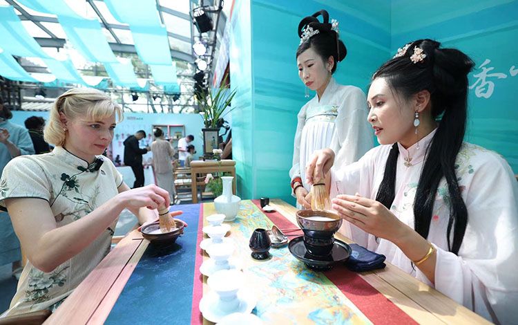 郡王府体验交流区,外国嘉宾正在学习制茶。