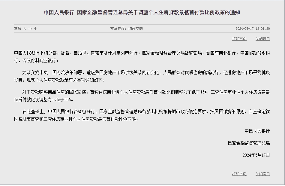 新京报讯 据中国人民银行网站消息,中国人民银行、国家金融监督管理总局发布关于调整个人住房贷款最低首付款比例政策的通知。原文如下: