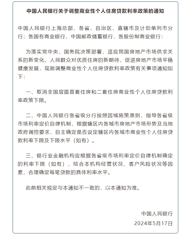 一、取消全国层面首套住房和二套住房商业性个人住房贷款利率政策下限