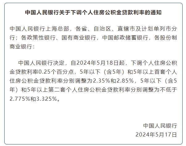 自2024年5月18日起,下调个人住房公积金贷款利率0.25个百分点,5年以下(含5年)和5年以上首套个人住房公积金贷款利率分别调整为2.35%和2.85%,5年以下(含5年)和5年以上第二套个人住房公积金贷款利率分别调整为不低于2.775%和3.325%。