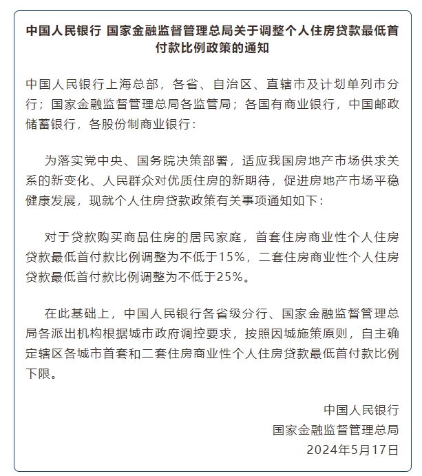 对于贷款购买商品住房的居民家庭,首套住房商业性个人住房贷款最低首付款比例调整为不低于15%,二套住房商业性个人住房贷款最低首付款比例调整为不低于25%。
