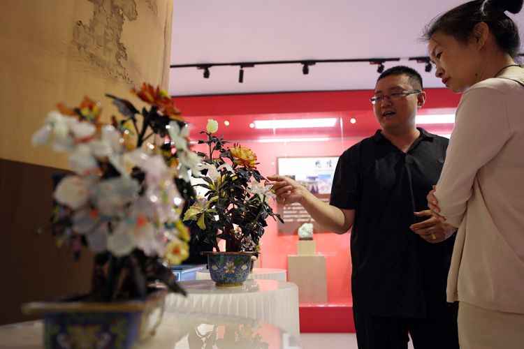 5月17日,在5·18国际博物馆日来临之际,“艺海拾珍”懋隆出口创汇精品艺术展在北京金漆镶嵌艺术博物馆开展,近百件套出口创汇时期的传统工艺精品集中亮相,展示中国传统工艺美术的独特魅力。图为工作人员介绍懋隆馆藏的景泰蓝玉石盆景。