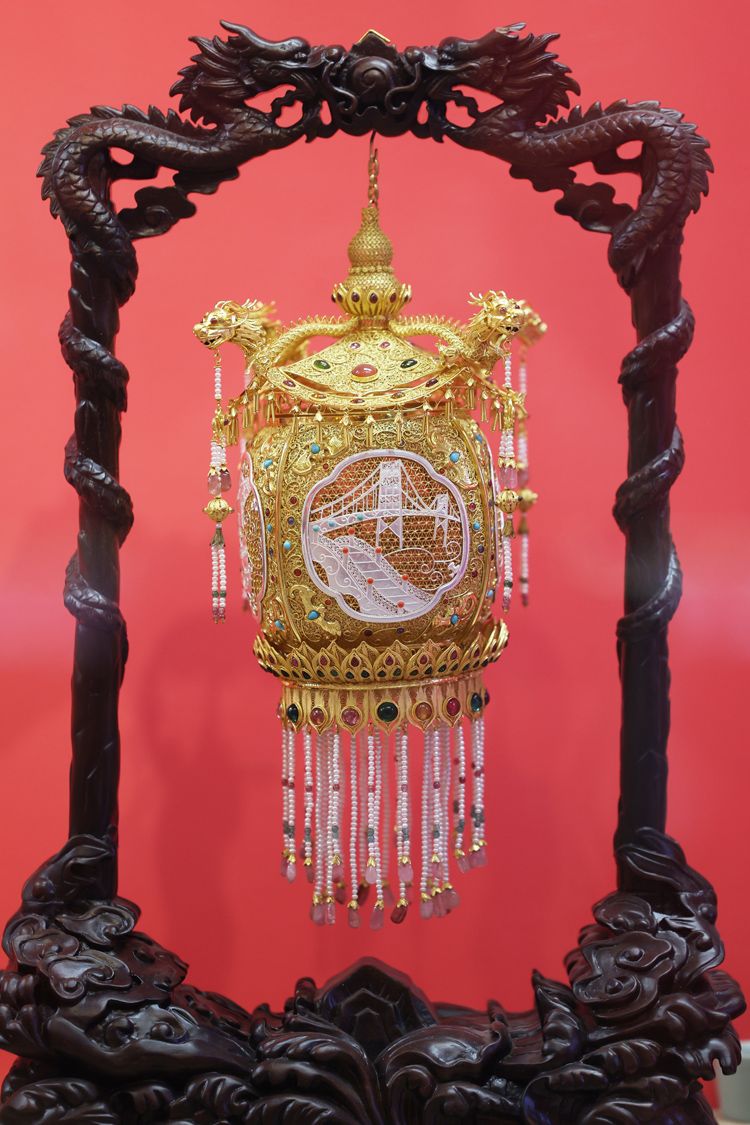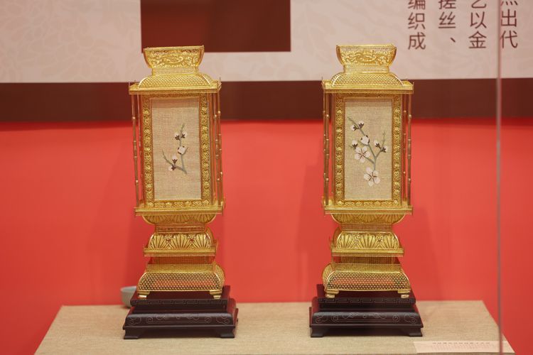 懋隆的前身是工美进出口公司,留存了许多出口创汇时期的工艺美术精品。此次的展品都是上世纪出口创汇时期的懋隆馆藏,包括花丝镶嵌首饰、玉雕摆件、景泰蓝、瓷器等多种艺术珍品,这些作品具有极高的艺术价值和历史价值,展现了非遗技艺和传统文化的传承与创新。图为花丝镶嵌缂丝四君子宫灯。