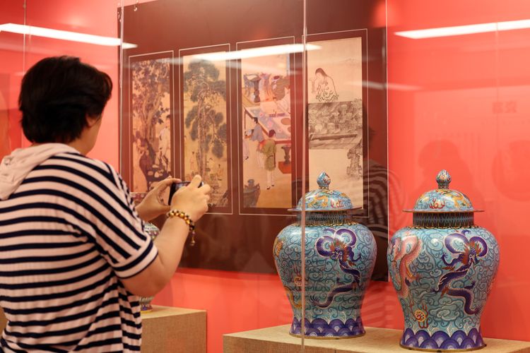市民参观红楼梦《露秋咏菊》屏风。