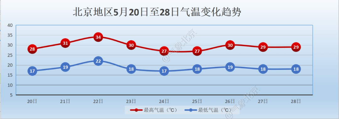 未来三天,暖阳高调回归,以晴到多云天气为主,气温也开始逐渐升高,尤其22日最高气温升至34℃。23日至25日天空云量增多,气温也随之有所回落。预计5月20日至28日南郊观象台最高气温27℃至34℃,最低气温17℃至22℃。