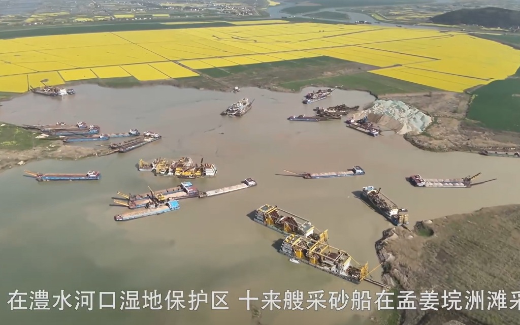 ▲中央生态环保督察组发现,10来艘采砂船在澧水河口湿地保护区内孟姜垸洲滩采砂。图/新华视点视频截图