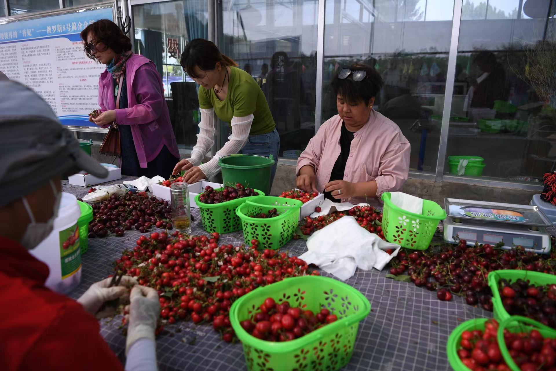 刘文坡的樱桃采摘园,工人正在分拣樱桃。新京报记者 陈琳 摄