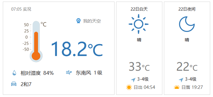 今日白天晴间多云,北风一级转南风三级左右,阵风五六级,最高气温33℃;夜间晴间多云,南风三级转北风一级,最低气温22℃。