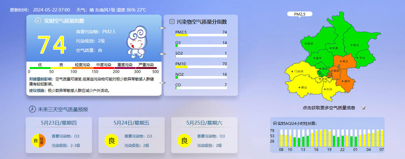 据北京市生态环境监测中心今早7时数据,目前实时空气质量指数74,污染级别2级,空气质量为良。