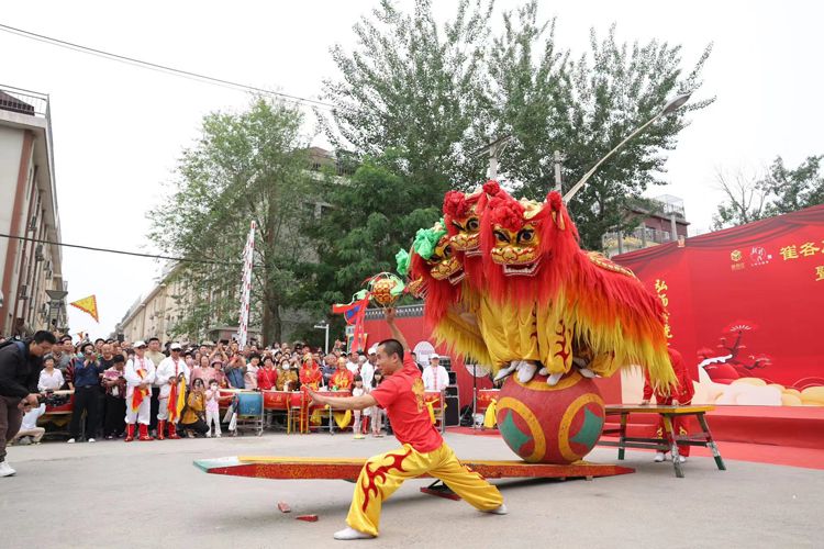 舞狮表演中,威风凛凛的狮子完成高难度动作。