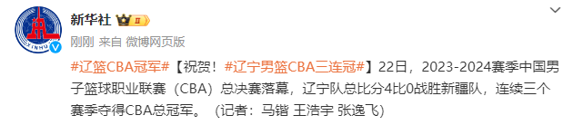 据新华社微博消息,22日,2023-2024赛季中国男子篮球职业联赛(CBA)总决赛落幕,辽宁队总比分4比0战胜新疆队,连续三个赛季夺得CBA总冠军。