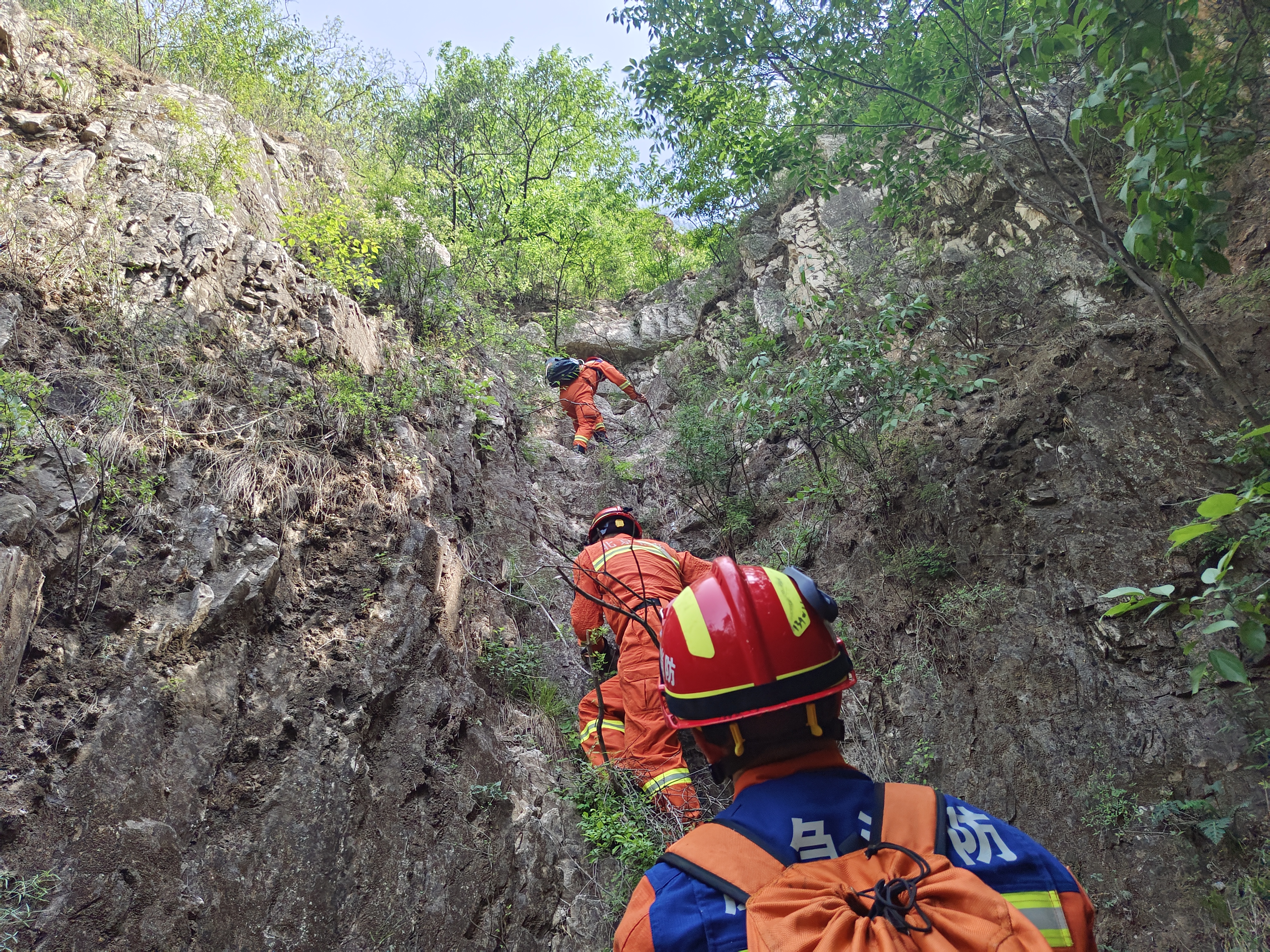 当到达男子所在区域时,消防救援人员再次与遇险人员取得联系,询问了遇险人员所能看到的标志性建筑物,并示意报警人挥舞衣物。消防救援人员通过望远镜寻找遇险人员,在锁定具体位置后,立即制定救援路线,并携带卫星电话、绳索、镰刀等器材及应急食品前往男子所在的位置。