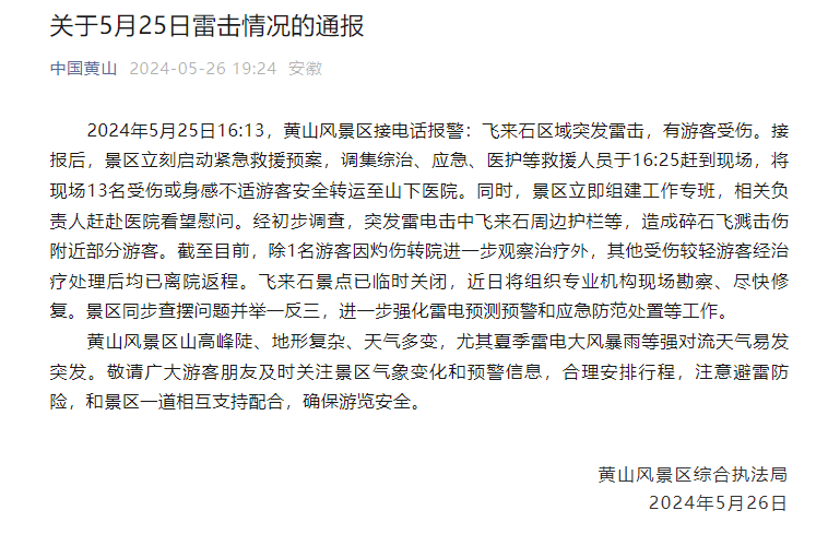 新京报讯 据中国黄山官微消息,2024年5月25日16:13,黄山风景区接电话报警:飞来石区域突发雷击,有游客受伤。接报后,景区立刻启动紧急救援预案,调集综治、应急、医护等救援人员于16:25赶到现场,将现场13名受伤或身感不适游客安全转运至山下医院。同时,景区立即组建工作专班,相关负责人赶赴医院看望慰问。经初步调查,突发雷电击中飞来石周边护栏等,造成碎石飞溅击伤附近部分游客。截至目前,除1名游客因灼伤转院进一步观察治疗外,其他受伤较轻游客经治疗处理后均已离院返程。飞来石景点已临时关闭,近日将组织专业机构现场勘察、尽快修复。景区同步查摆问题并举一反三,进一步强化雷电预测预警和应急防范处置等工作。