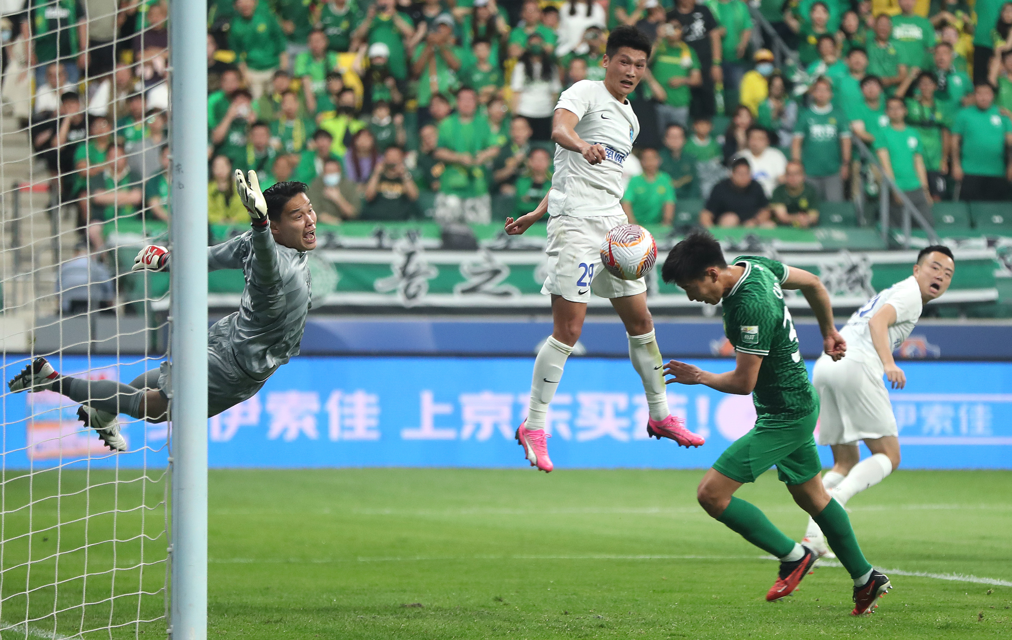 北京国安队球员曹永竞(右二)在比赛中头球攻门。图/新华社