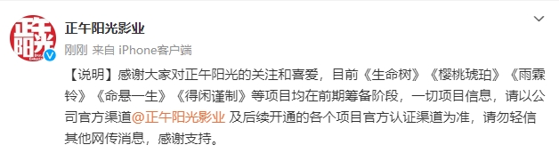 正午阳光称《生命树》等项目均在筹备阶段,勿轻信网传消息