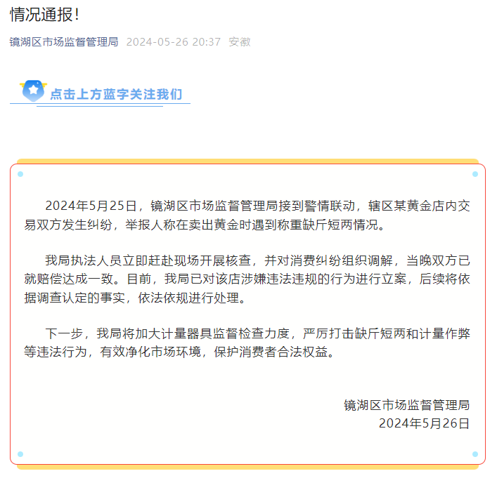 新京报讯 据镜湖区市场监督管理局官微消息,2024年5月25日,镜湖区市场监督管理局接到警情联动,辖区某黄金店内交易双方发生纠纷,举报人称在卖出黄金时遇到称重缺斤短两情况。