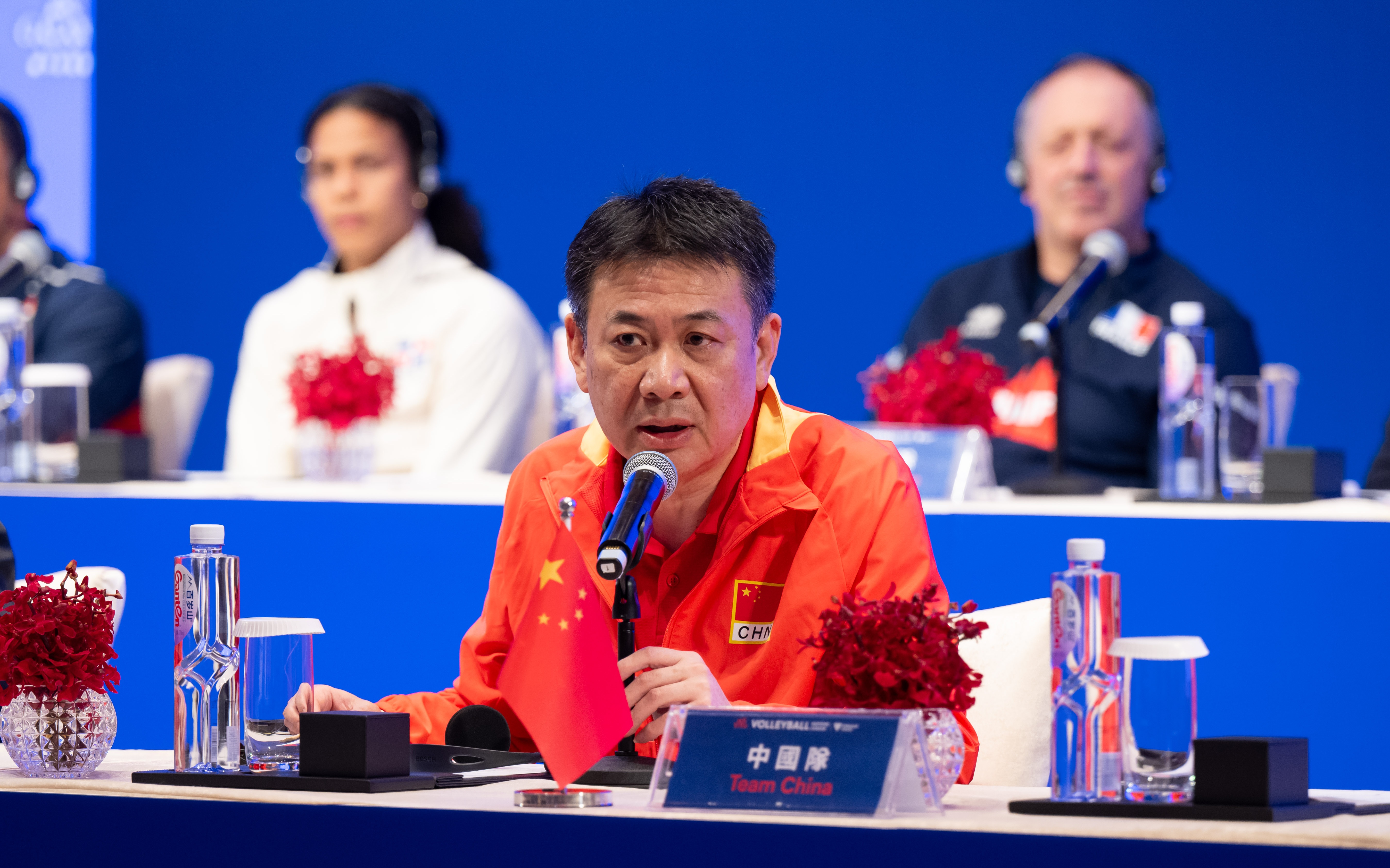 中国女排主教练蔡斌在赛前新闻发布会上发言。 图/新华社