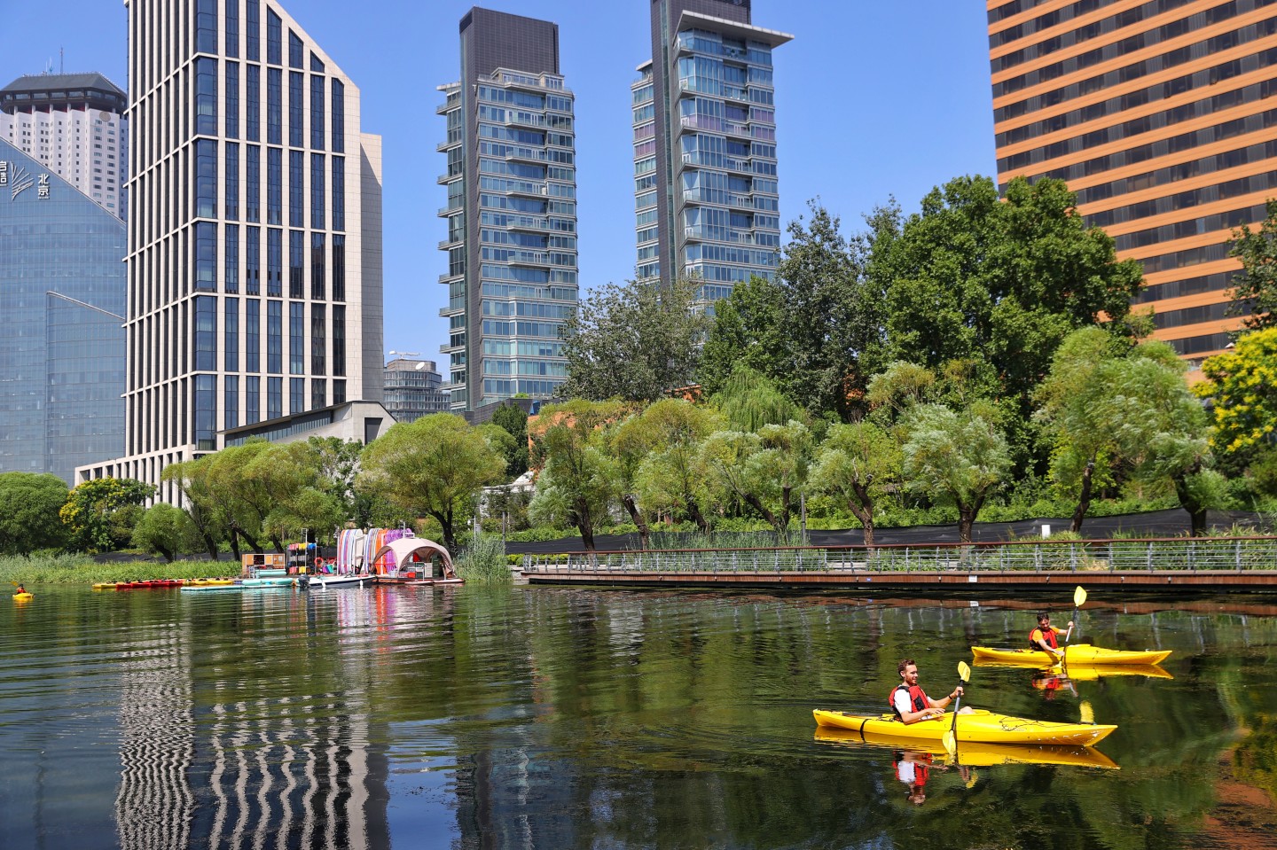 2023年8月19日,朝阳区亮马河国际风情水岸,水清岸绿,人们在体验皮划艇项目。 新京报记者 王飞 摄