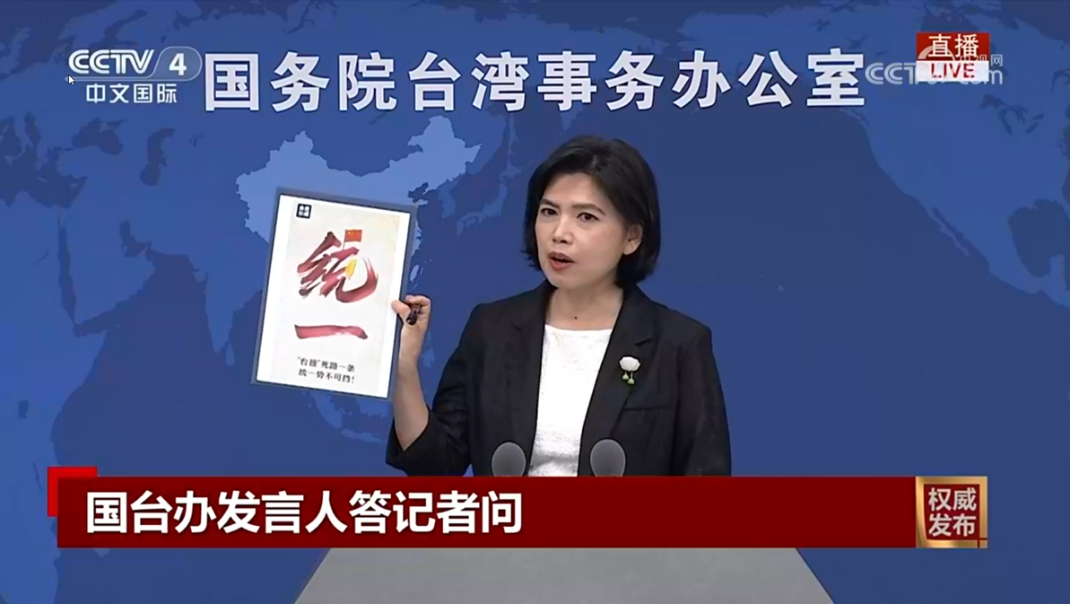 据央视新闻消息,国务院台办今天(29日)举行例行新闻发布会。会上,发言人朱凤莲引用央视新闻的海报答记者问。
