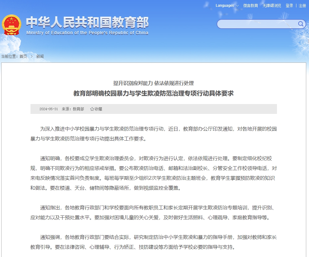 教育部明确校园暴力与学生欺凌防范治理专项行动具体要求