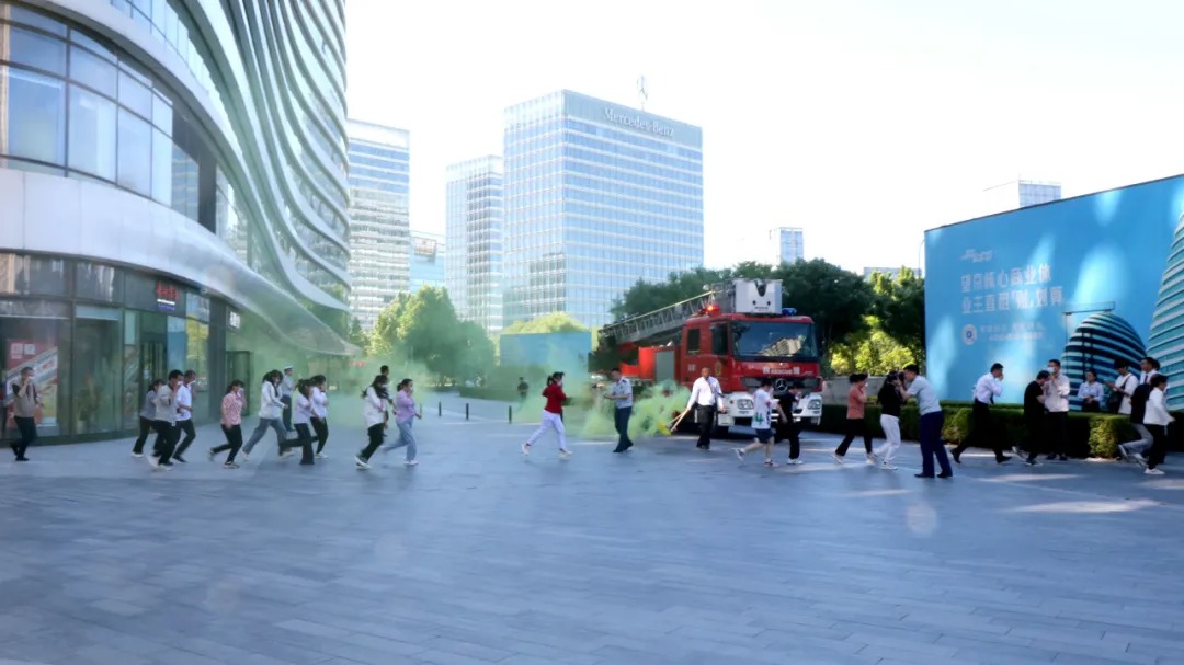 上午9时,演练正式开始。现场模拟望京SOHO塔3五层施工改造出现火花,引燃周边可燃物的场景。火势迅速蔓延,有大量浓烟,造成人员被困。单位立即启动应急处置预案,利用应急广播引导办公楼内工作人员疏散逃生,启动固定消防设施,调派微型消防站到场处置,单位的技术处置队全程保障。