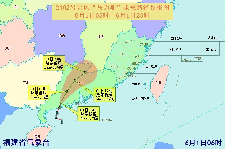 新京报讯 据“福建发布”消息,今年第2号台风“马力斯”已于今天(6月1日)凌晨0时55分前后在广东省阳江市阳西县沿海登陆,预计今天白天“马力斯”强度将进一步减弱,但其携带而来的充沛暖湿气流仍将给广东、福建、浙江、江西等地带来强降雨天气。