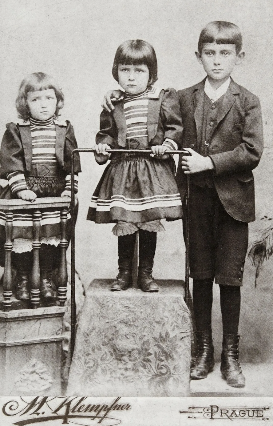 卡夫卡(约10岁)与妹妹瓦莉(左)和艾莉。