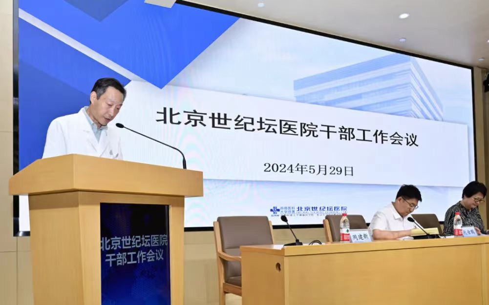 新京报讯 据首都医科大学附属北京世纪坛医院官微消息,5月29日下午,首都医科大学附属北京世纪坛医院召开干部工作会议。市委组织部行政干部处处长、一级调研员代金鹏同志,市卫生健康委党委副书记、副主任、一级巡视员潘苏彦同志,市委组织部行政干部处干部郎冬雪同志,市医管中心组织与人力资源管理处处长李方亮同志、干部孙雯雯同志,以及本院领导班子成员、全体中层干部、党支部书记参加会议。会议由潘苏彦同志主持。