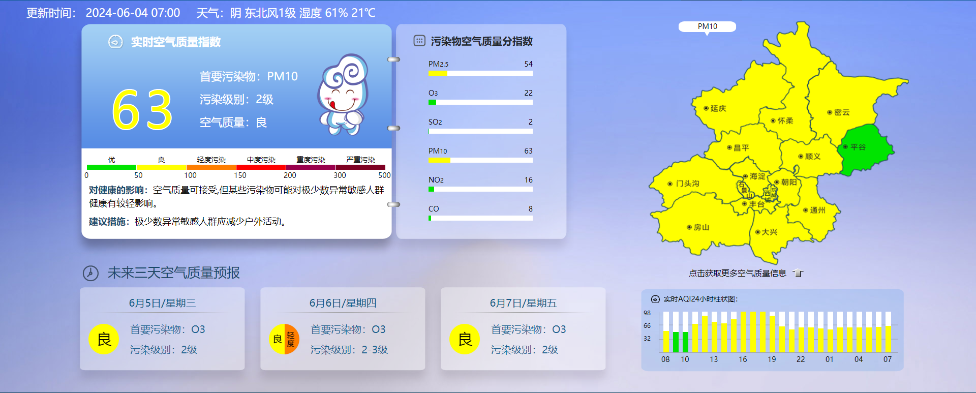 据北京市生态环境监测中心今早7时数据,目前实时空气质量指数63,污染级别2级,首要污染物PM10,空气质量良。