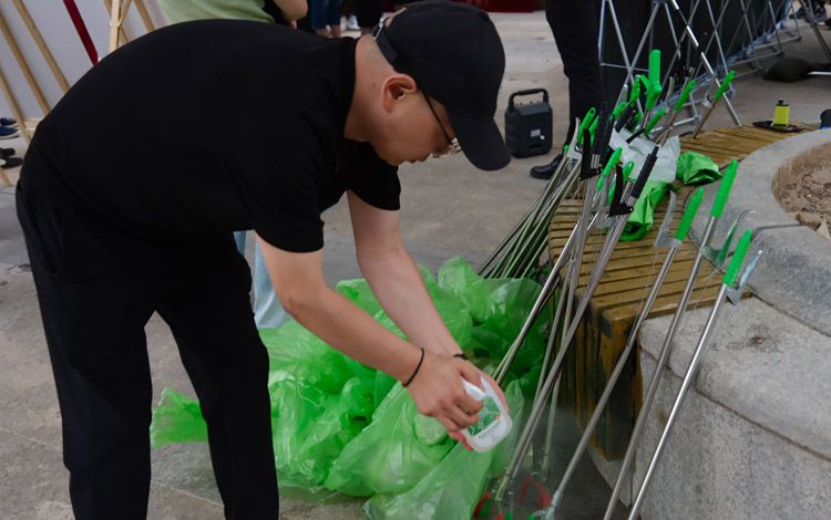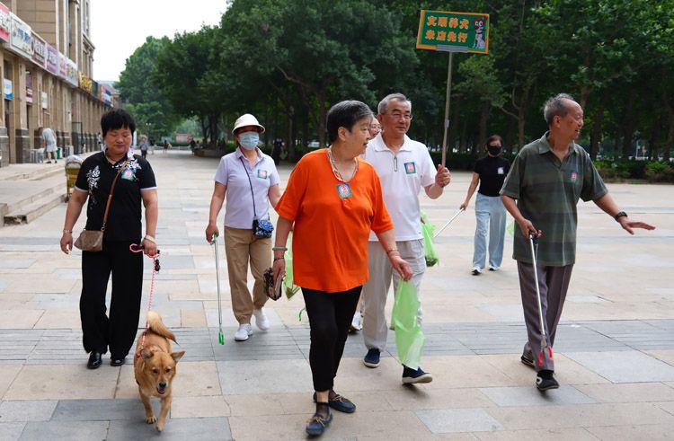 居民分成小组,参加宠物粪便清理活动。