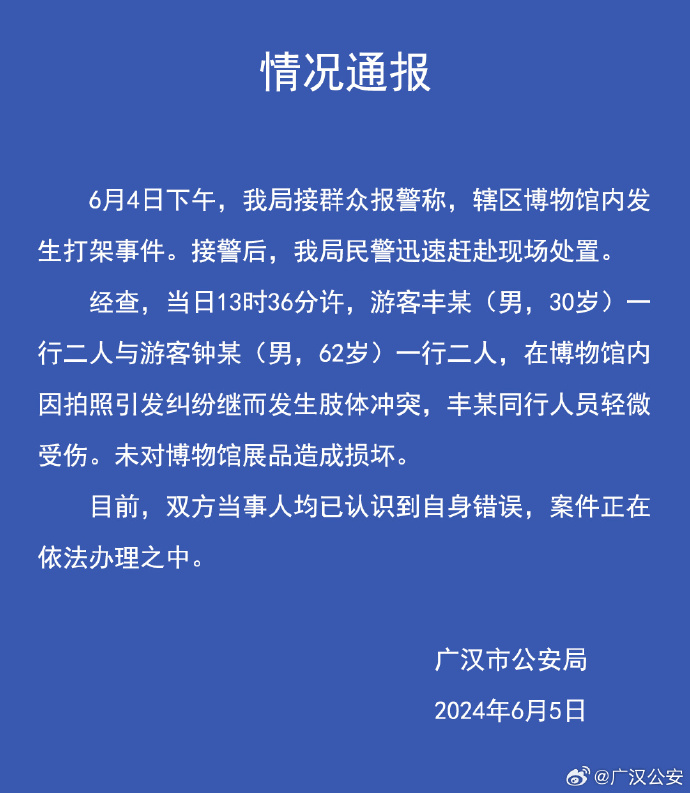 新京报讯 6月5日,四川省广汉市公安局官方微博发布通报:6月4日下午,该局接群众报警称,辖区博物馆内发生打架事件。接警后,该局民警迅速赶赴现场处置。