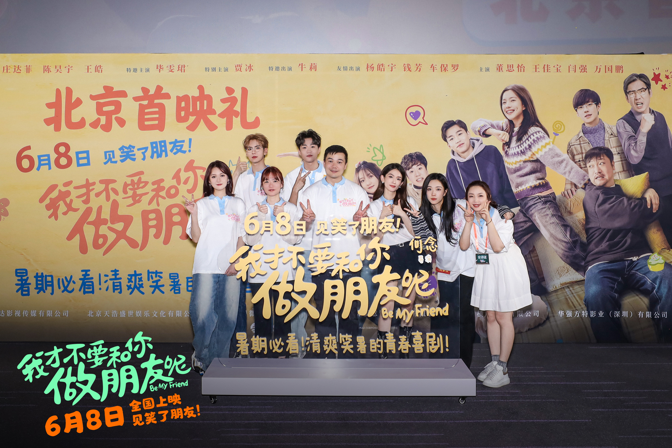 新京报讯(记者周慧晓婉)6月5日,青春喜剧电影《我才不要和你做朋友呢》举办“开笑季”北京首映礼。导演何念、制片人程睿、编剧肖诗瑶、演员庄达菲、陈昊宇、王皓、毕雯珺、董思怡亮相首映礼现场,与观众分享幕后趣事。影片由何念执导,庄达菲、陈昊宇、王皓领衔主演,毕雯珺特邀主演,贾冰特别主演,牛莉特邀出演,杨皓宇、钱芳、车保罗友情出演,董思怡、王佳宝、闫强、万国鹏主演,于6月6日-6月7日在全国点映,6月8日正式上映。
