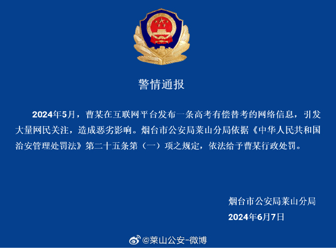 山东烟台警方:两人在网上发布高考代考、有偿替考信息被行政处罚