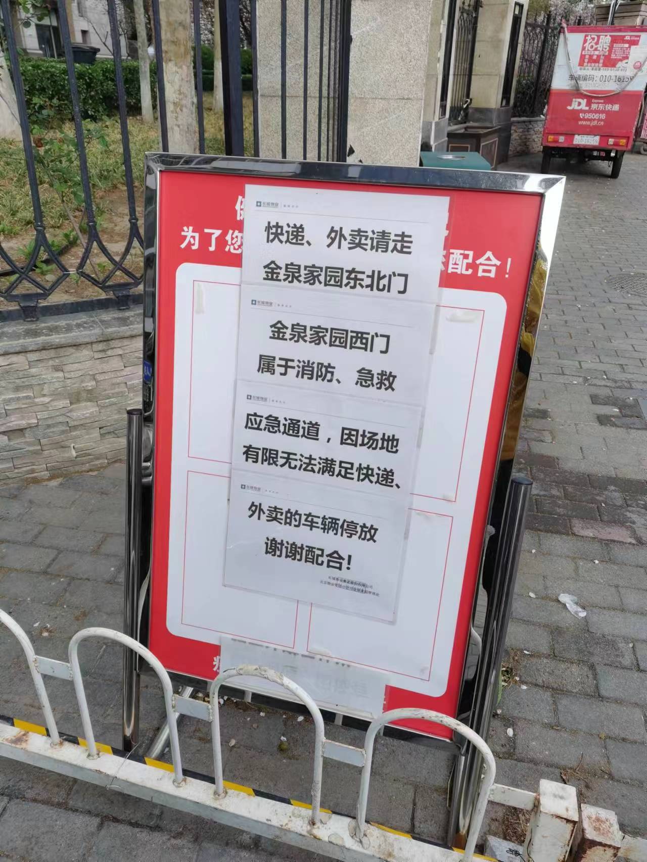 梁宁宁起诉长城物业后,新京报记者曾实地探访金泉家园。不过,此时小区的东北门、东南门以及西门均已开放外卖员和快递员正常出入。