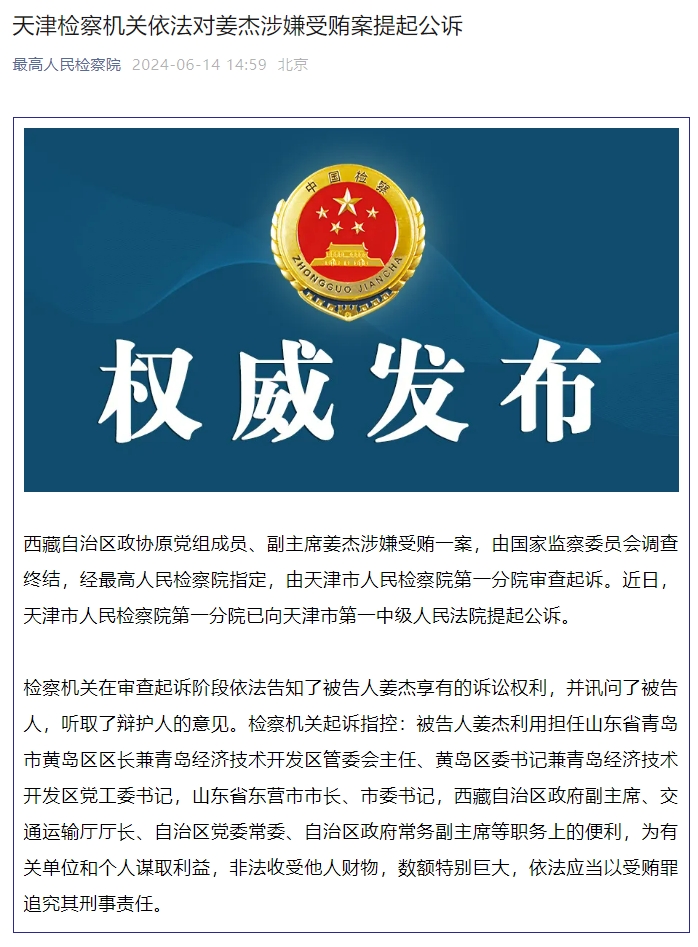 新京报讯 据最高人民检察院消息,西藏自治区政协原党组成员、副主席姜杰涉嫌受贿一案,由国家监察委员会调查终结,经最高人民检察院指定,由天津市人民检察院第一分院审查起诉。近日,天津市人民检察院第一分院已向天津市第一中级人民法院提起公诉。