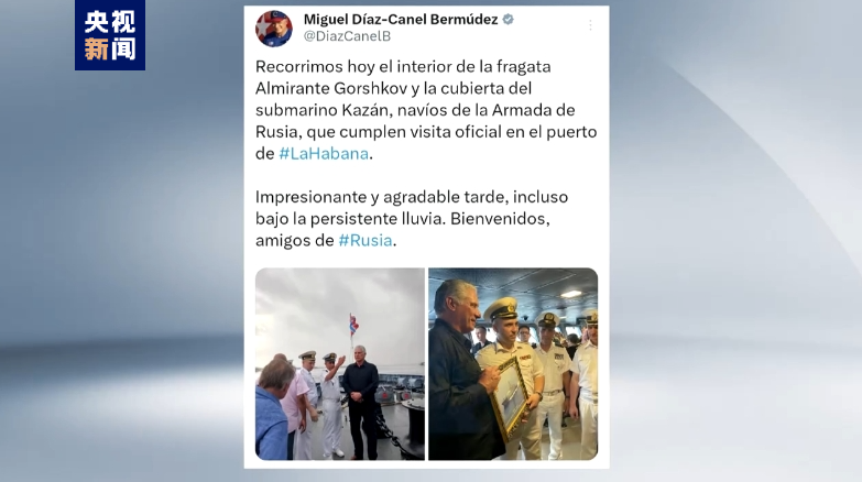 据央视新闻客户端消息,古巴国家主席迪亚斯-卡内尔当地时间15日通过社交媒体发布消息说,他参观了正在访问哈瓦那港的俄海军 “戈尔什科夫海军元帅”号护卫舰,以及 “喀山”号核潜艇。
