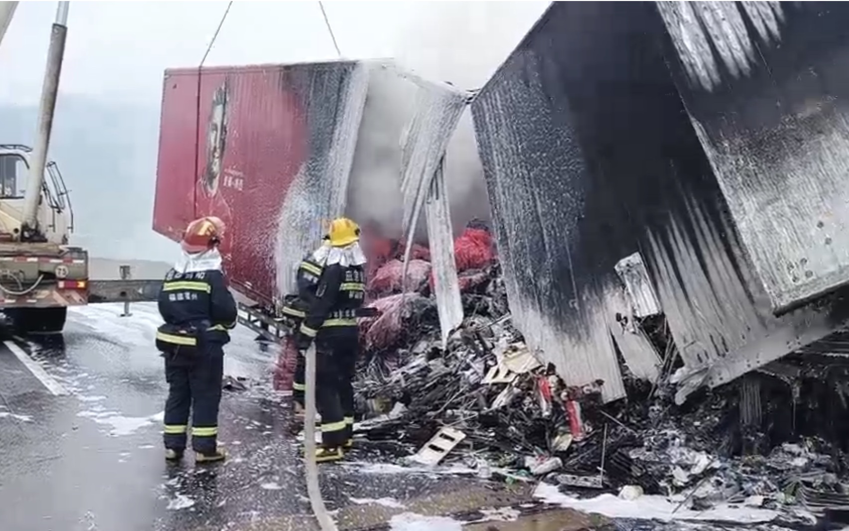 随后,消防员使用爬梯,从货车上方对车厢内部再次进行冷却降温。由于车厢已经断成两截,协调吊车到场后,消防员在吊车协助下继续对货物进行冷却降温,直至确认无复燃危险。