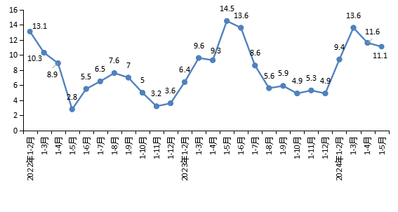 需求方面,1-5月,北京固定资产投资(不含农户)同比增长11.1%,增速较1-4月回落0.5个百分点。其中,制造业投资增长34.7%,基础设施投资增长10.7%,房地产开发投资下降0.7%。