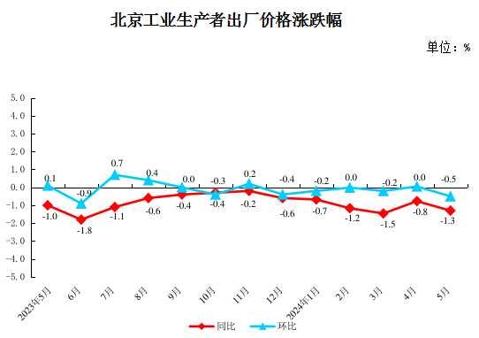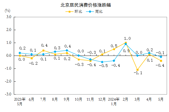 5月份,北京CPI同比下降0.1%,环比下降0.4%。国家统计局北京调查总队表示,受节后消费需求回落影响,北京CPI出现环比季节性下降、同比由正转负的情况。