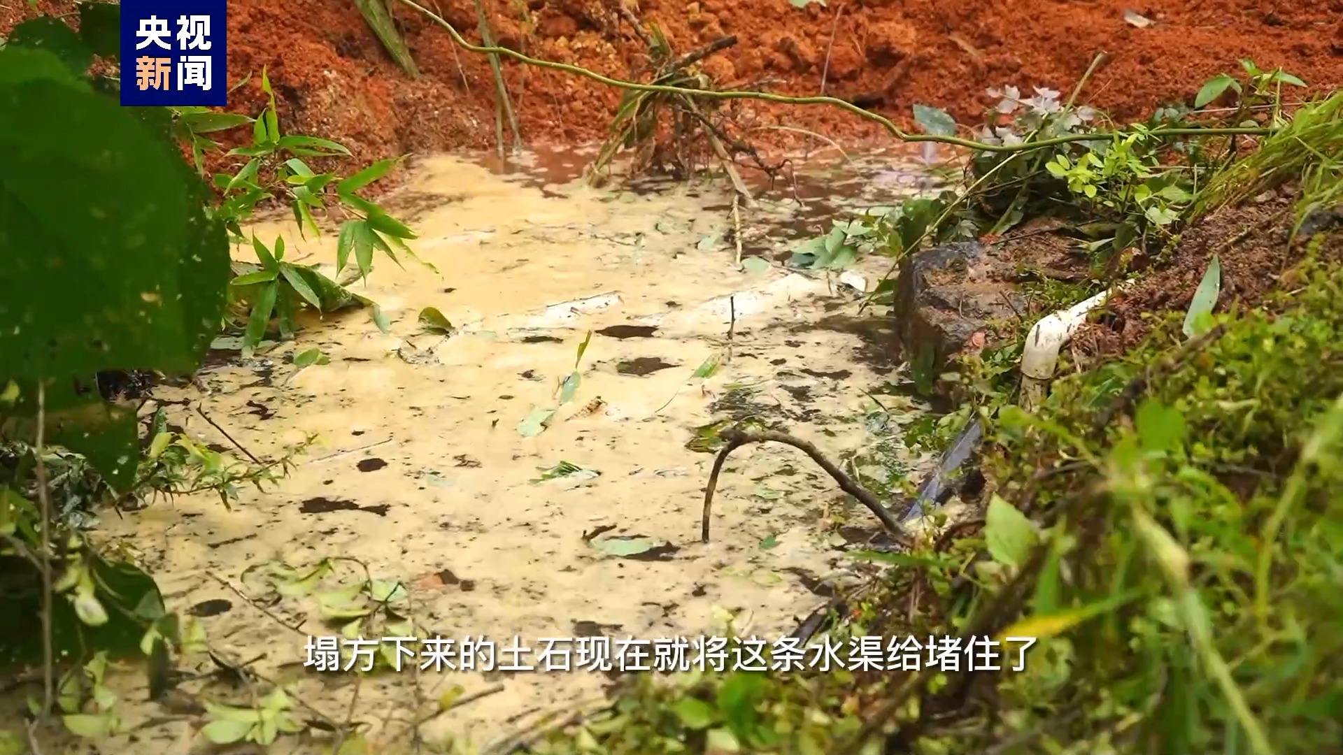 塌方下来的土石将这条村里的水渠给堵住了,水没办法从这里流走,而是漫过路面,流进了村子里边。虽然说现在积水已经消退了不少,但是村民告诉记者,在17日和18日早上积水最深的时候超过了一米。