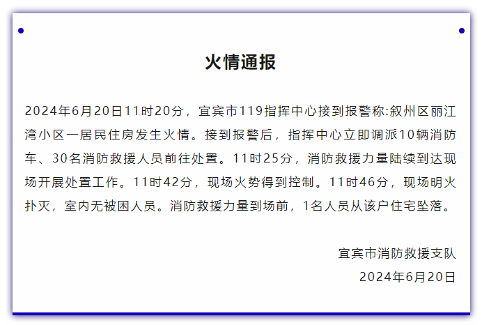 新京报讯 据宜宾发布官微消息,2024年6月20日11时20分,宜宾市119指挥中心接到报警称:叙州区丽江湾小区一居民住房发生火情。接到报警后,指挥中心立即调派10辆消防车、30名消防救援人员前往处置。11时25分,消防救援力量陆续到达现场开展处置工作。11时42分,现场火势得到控制。11时46分,现场明火扑灭,室内无被困人员。消防救援力量到场前,1名人员从该户住宅坠落。