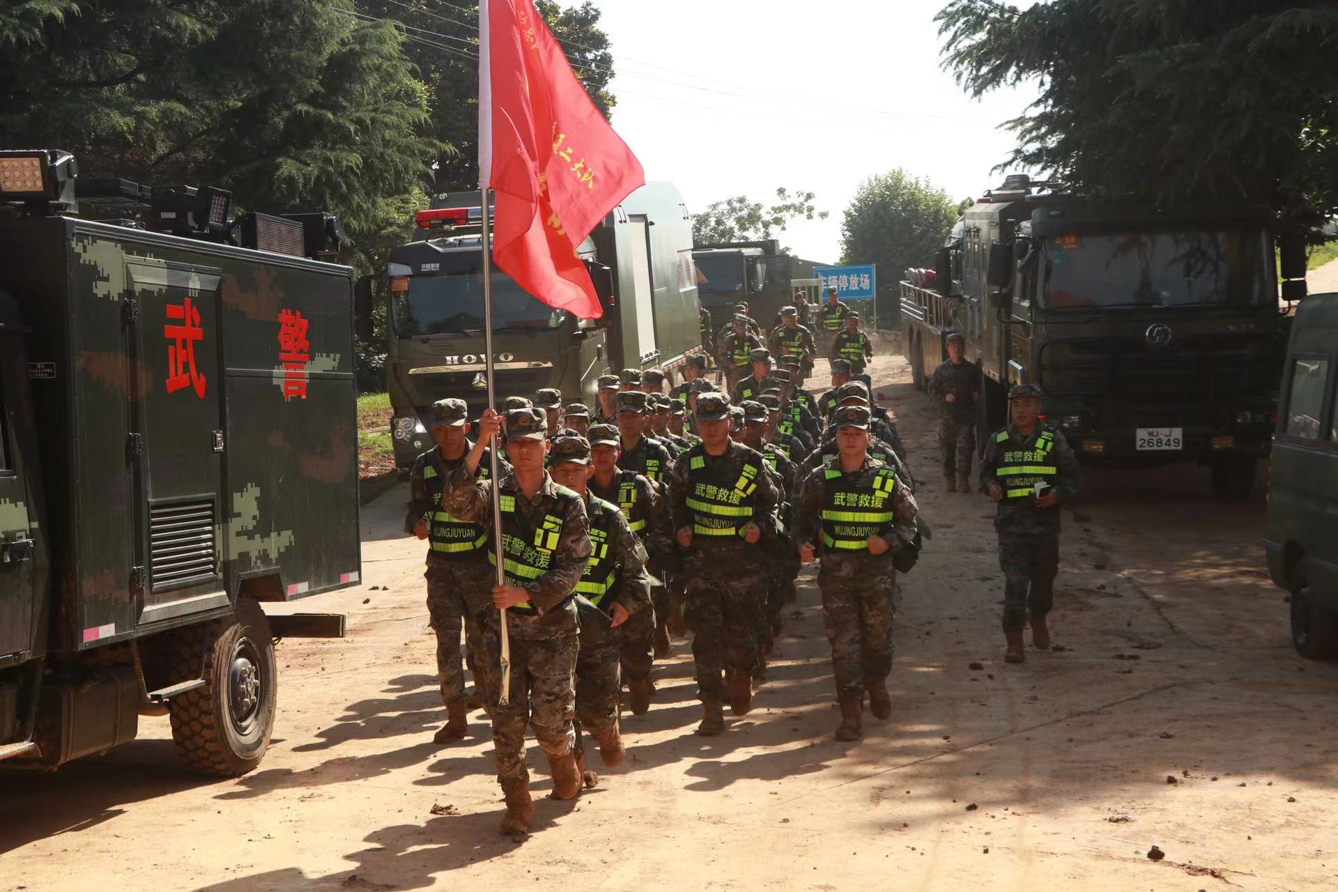 近日受强降雨影响,安徽省黄山市多地出现内涝积水、人员受困、通信供电中断等情况,发生多处山体滑坡导致堰塞湖决堤。武警第二机动总队某支队受领任务后,迅速出动各型车辆装备紧急驰援。图为武警官兵集结前往黄山市歙县横关村进行救援。
