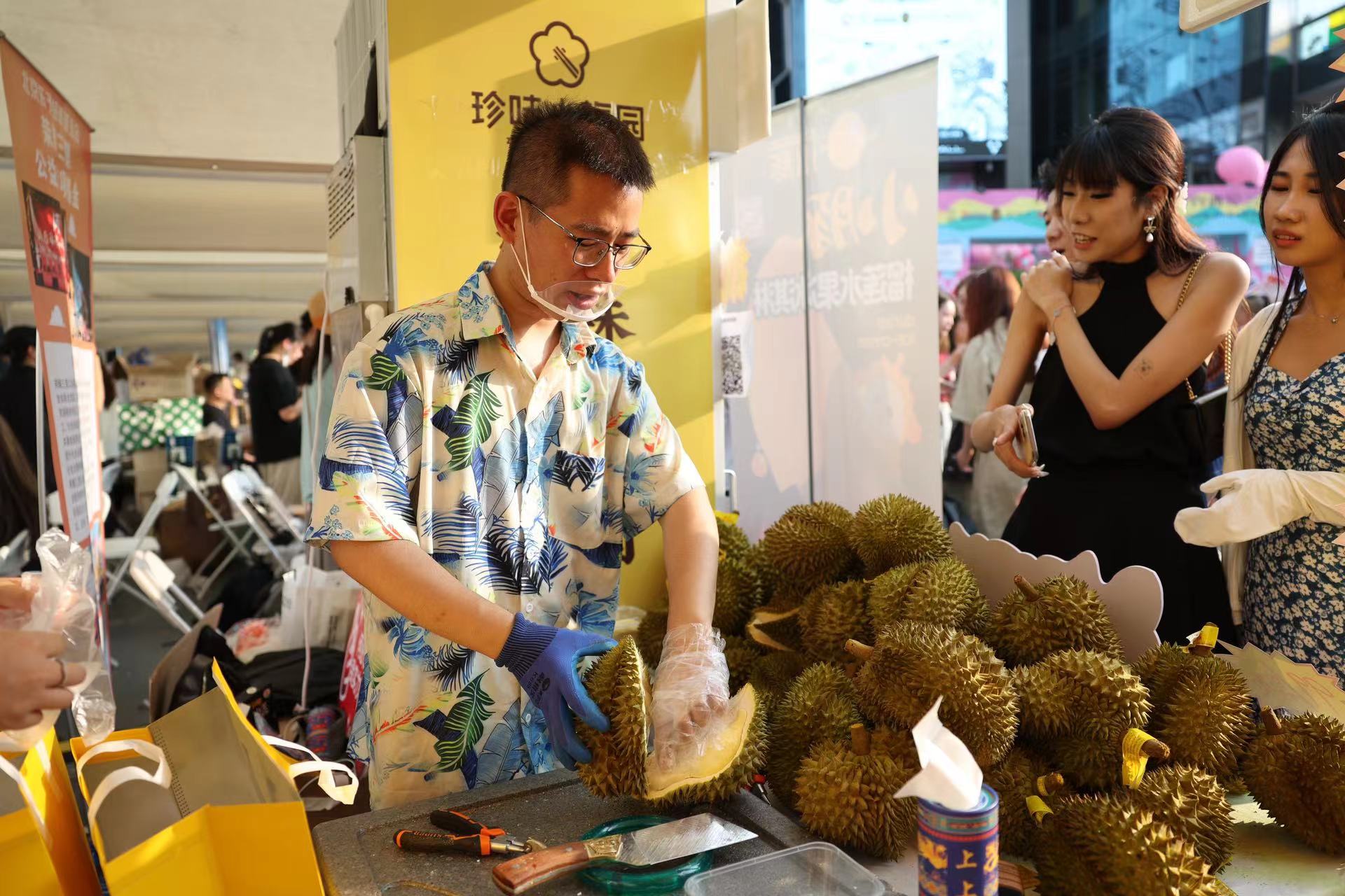 市民正在摊位挑选榴莲。本次活动为期三天,将持续至6月23日,以“让世界遇见三里屯”为主题,旨在庆祝中泰建交50周年,促进两国文化、商业交流。据悉,这是泰王国驻华大使馆第九次举办泰国节。