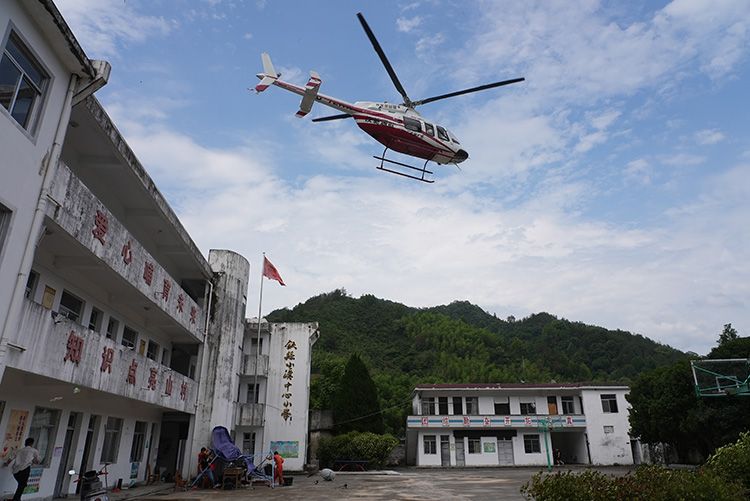 6月21日下午,在黄山市歙县绍濂乡小溪村小溪中心小学临时教学点楼顶,救援直升机在上空盘旋几圈后平稳降落,为临时安置点群众及附近村民送来了急需的水和部分食物。小溪村的村民盼来了他们急需的补给。