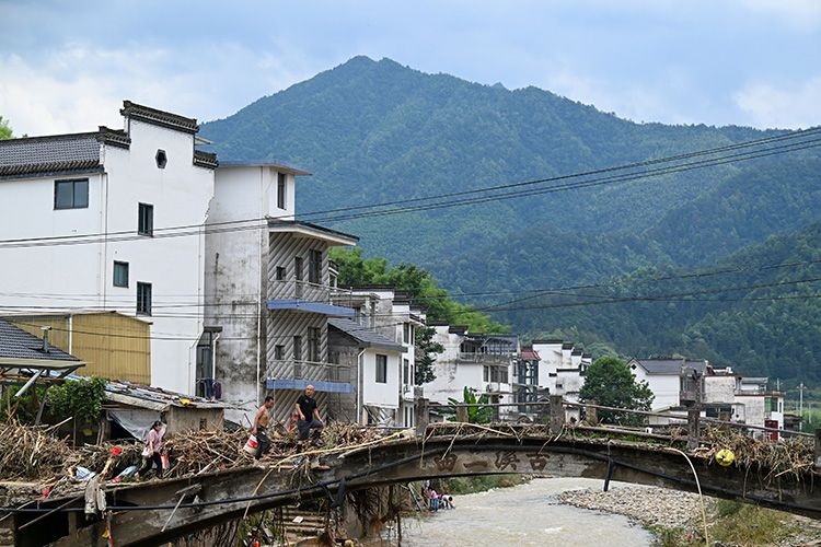 歙县绍濂乡街头,救灾工作正在继续。据了解,近日强降雨导致黄山市境内多地出现不同程度灾情。目前全市各部门正全力投入到灾后生产自救工作中。