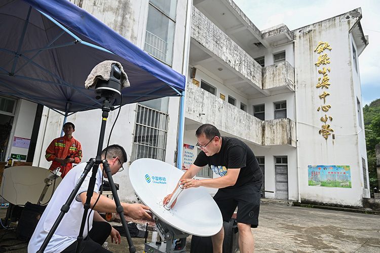 6月21日,安徽省黄山市移动公司员工在歙县绍濂乡小溪村中心小学架设便携一体式卫星基站,13点15分,随着一通电话的拨出,小溪村与外界的通讯终于恢复正常。黄山市移动网络部技术员周成功为了这一刻,和同事背着25公斤重的便携一体式卫星基站,徒步4个多小时,翻越多处塌方及水毁路段,终于抵达他们此行的目的地小溪村。